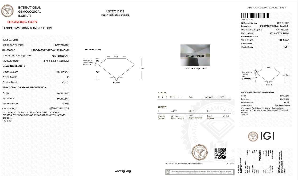 1.0CT VVS1 E 717515229 Pear Cut Lab Grown Diamond